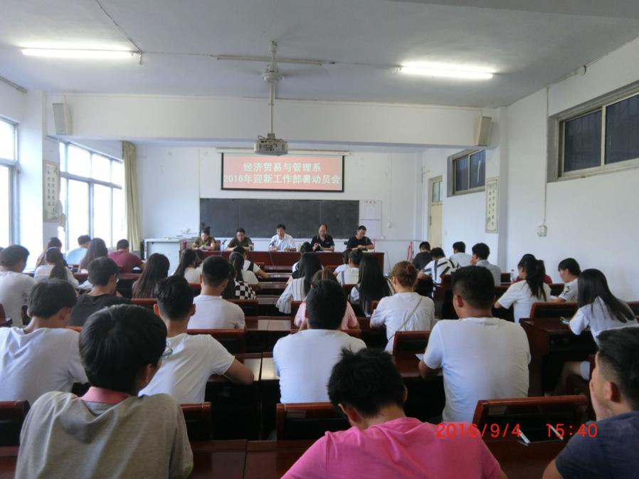 新学期,新血液。为了确保今年新生入学各项工作井然有序、高标准、高质量完成,真正做到让新生满意,让新生家长放心,让社会认可。经济贸易与管理系于201694日下午在1301教室举行了2016新生接待部署工作安排会。出席的有系主任兰涛,系党总支书记张改亮,副主任李炎超,办公室主任王珂琦,团总支书记李文静。会议由兰主任主持。