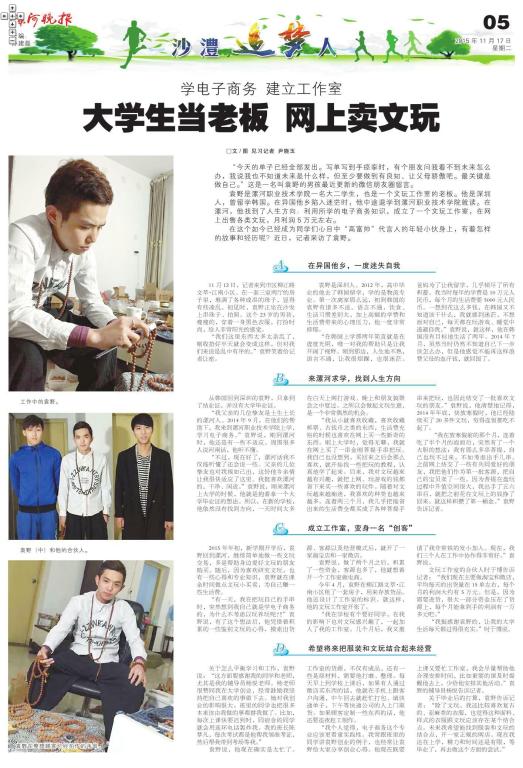 袁野是sunbet官网工商管理系电子商务专业2014级的一名学生。该生来自南方城市深圳市,在工商管理系电子商务专业求学的同时,利用自己所学到的电商知识在网上开了一家古玩店,业务开展得比较顺利,月收入达到5万元。“漯河晚报”对他的事迹进行了报道。