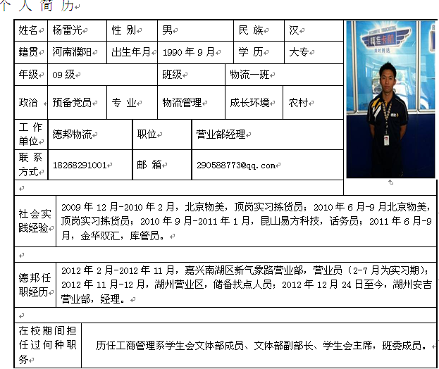 我叫杨雷光,曾经是sunbet官网工商管理系09级物流一班的一员,现在是杭州德邦货运代理有限公司安吉分公司经理。