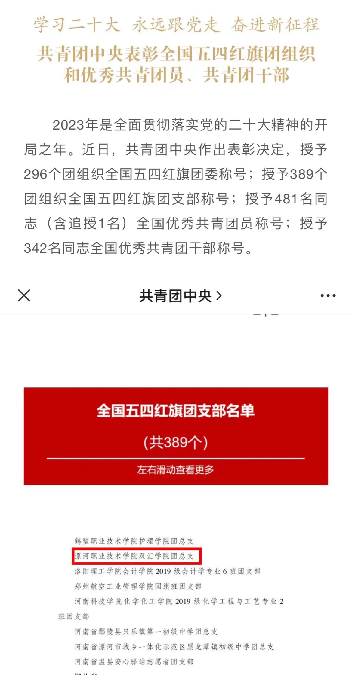 2023年是全面贯彻落实党的二十大精神的开局之年。近日,共青团中央作出表彰决定,授予296个团组织全国五四红旗团委称号;授予389个团组织全国五四红旗团支部称号;授予481名同志(含追授1名)全国优秀共青团员称号;授予342名同志全国优秀共青团干部称号。sunbet官网双汇学院团总支荣获“全国五四红旗团支部”荣誉称号,这是共青团中央授予全国基层团组织的最高荣誉。