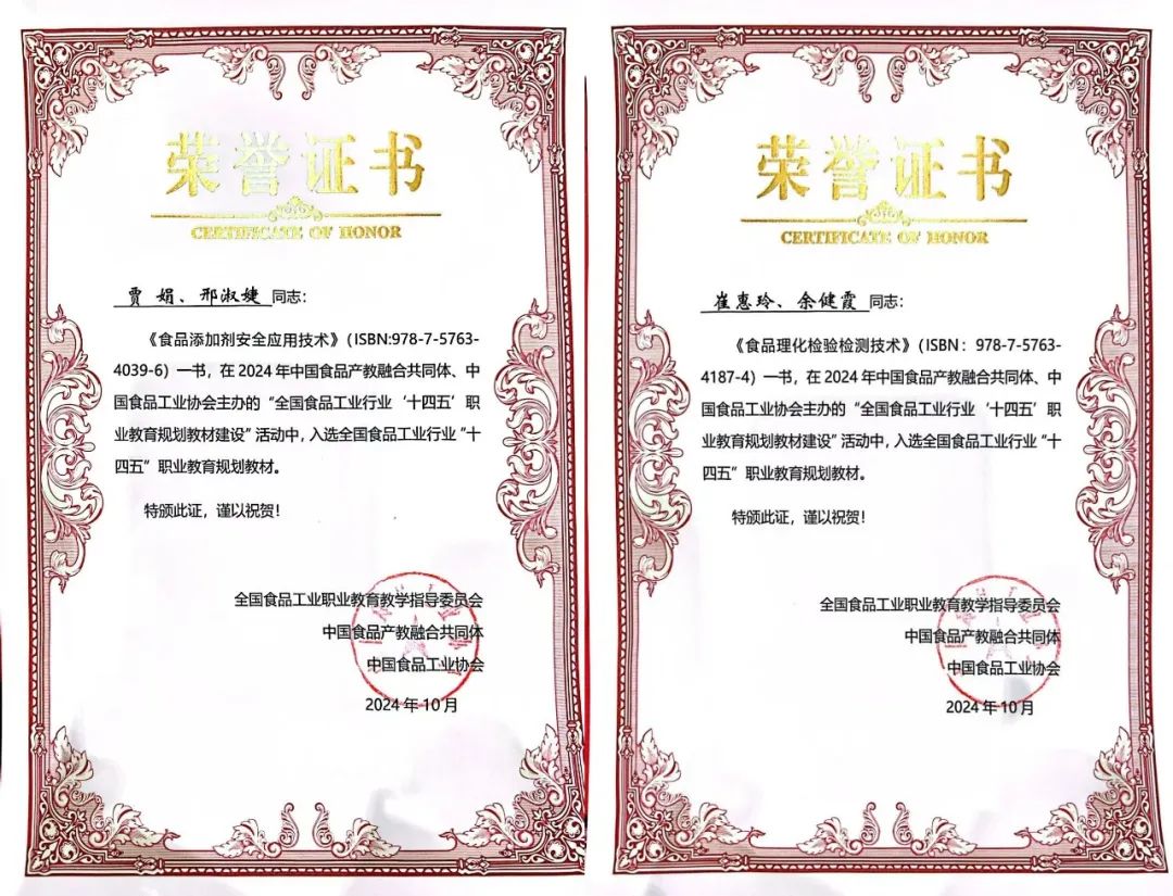 近日,中国食品工业协会和全国食品工业职业教育教学指导委员会联合公布了“全国食品工业行业‘十四五’职业教育规划教材” 名单,sunbet官网贾娟、邢淑婕主编的《食品添加剂安全应用技术》和崔惠玲、余健霞主编的《食品理化检验检测技术》成功入选。