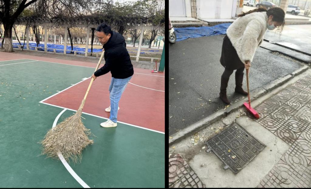 校园环境清扫组高效清理主干道及绿化带内大量落叶,确保道路整洁通畅;