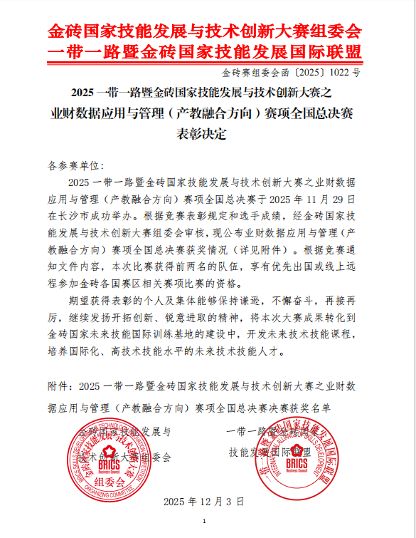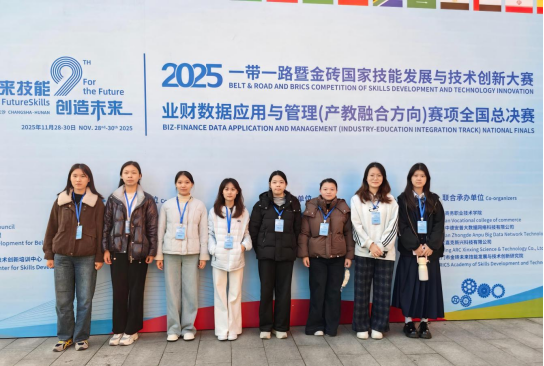 近日,“2025一带一路暨金砖国家技能发展与技术创新大赛”之业财数据应用与管理(产教融合方向)赛项全国总决赛在湖南商务职业技术学院圆满落幕。sunbet官网sunbet官网派出康蕊、赵甘露、王子怡、杨黎敏及赵思甜、孟琬、杨殿杰、钱卓亚8名同学组成的两支参赛团队表现亮眼,凭借扎实的专业功底和默契的团队协作,从众多参赛队伍中脱颖而出,双双斩获高职组三等奖,为学校赢得了荣誉。