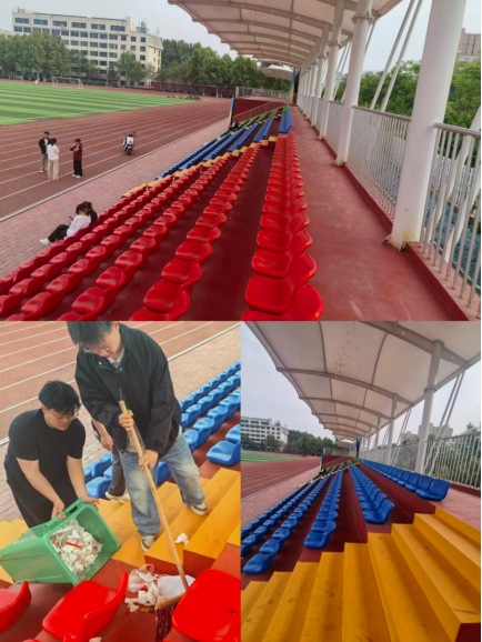 作为学校西操场的责任保洁单位,我院同学把劳动课堂搬到了赛事现场,用全程坚守保洁,为运动会保驾护航。运动会开幕前夜,当校园渐渐归于安静,同学们已经拿着扫帚、垃圾袋、清洁工具来到西操场,完成了首次全场深度清扫,不放过看台缝隙里的细碎杂物、场地边角的隐藏垃圾;次日清晨不到7点,同学们便再度集结,在赛事开场前完成了第二次精细化保洁,用干净整洁的场地与看台,迎接奔赴赛场的师生。