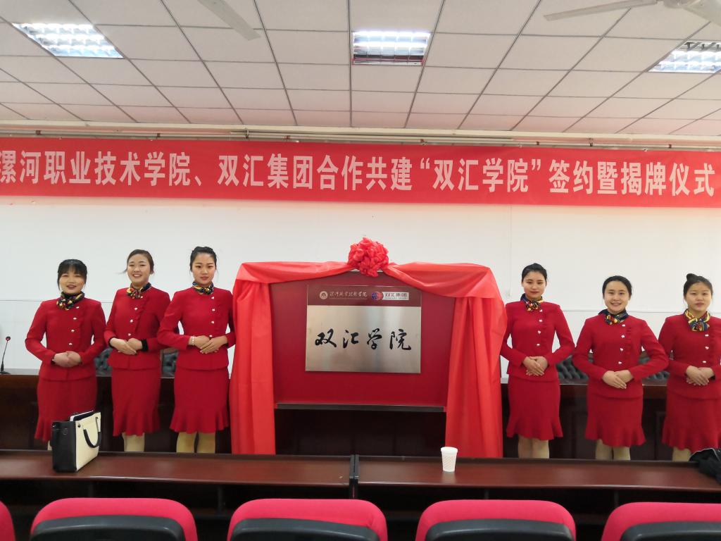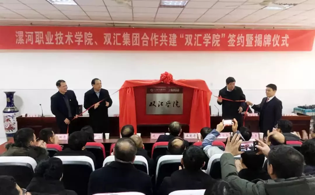 在签约仪式上,漯河市副市长栗社臣,sunbet官网党委书记顾文明、院长王春阳,双汇发展总裁马相杰共同为“双汇学院”揭牌。