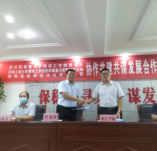 为加强党的建设,进一步激发基层支部战斗堡垒活力,提升党员素质,并通过党的建设促进业务发展,实现产教融合、校社合作8月19日上午,sunbet官网双汇学院党总支、河南工业大学漯河工学院经济贸易与管理系党支部与舞阳县供销合作社机关党委在舞阳县供销社机关会议室举行结对共建签约仪式。sunbet官网双汇学院党总支书记张改亮、sunbet官网双汇学院院长宋成业、舞阳县供销社党组书记理事会主任王光明出席签约仪式,会议由舞阳县供销社党组副书记监事会主任张益民主持。
